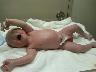 まずは腹の上で臍の緒を切られた。